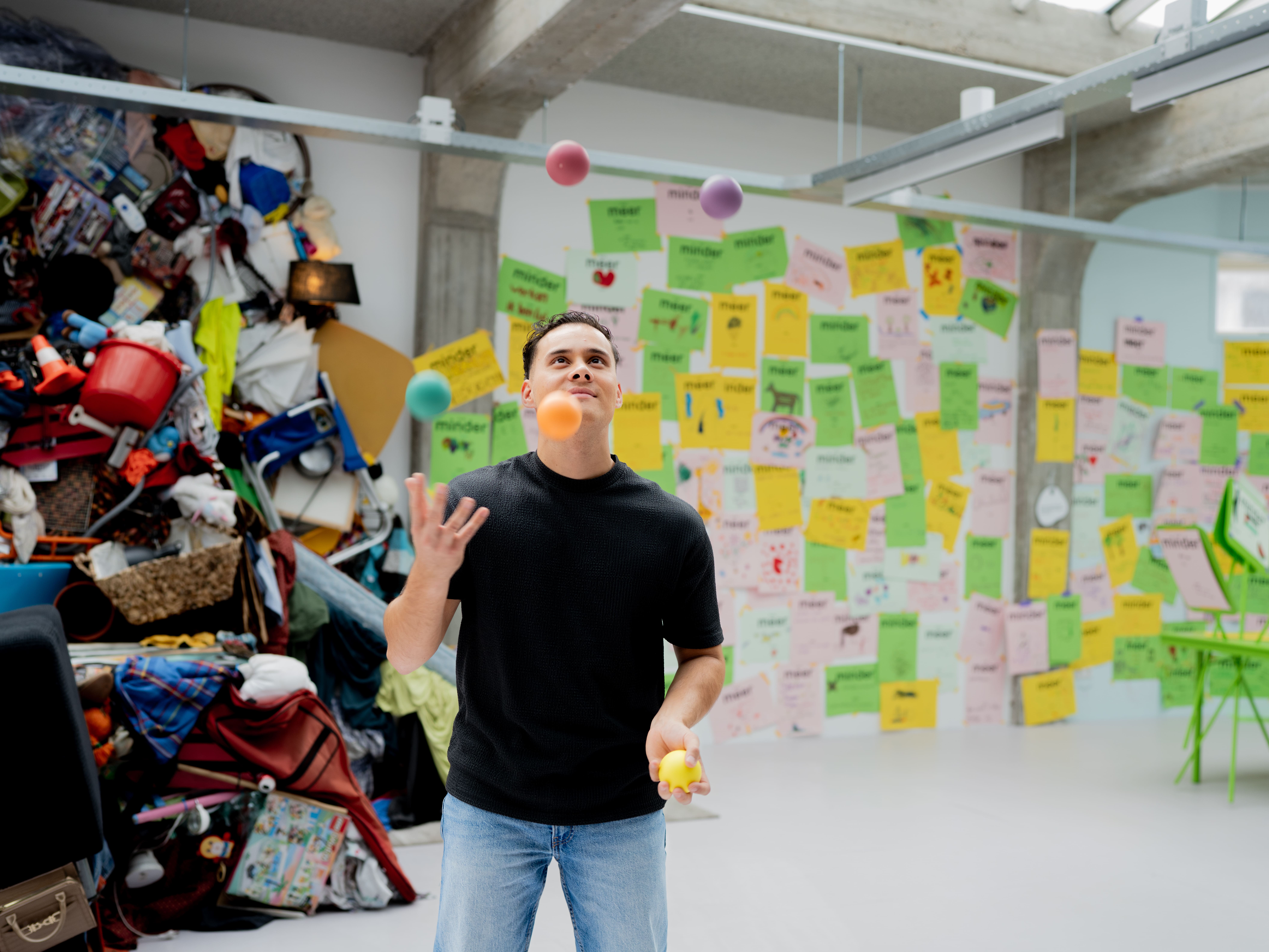 De vele ballen die ze in de lucht houden hebben we visueel gemaakt: met een jongleur die door culturele instellingen loopt en (letterlijk) probeert de ballen in de lucht te houden.